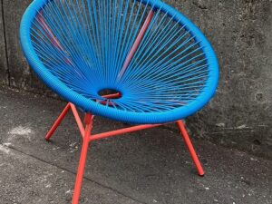 鮮やかなブルーの座面に、赤のスチール脚を組み合わせた印象的なポップなカラーデザインで、屋外・屋内問わず映える一脚です。
