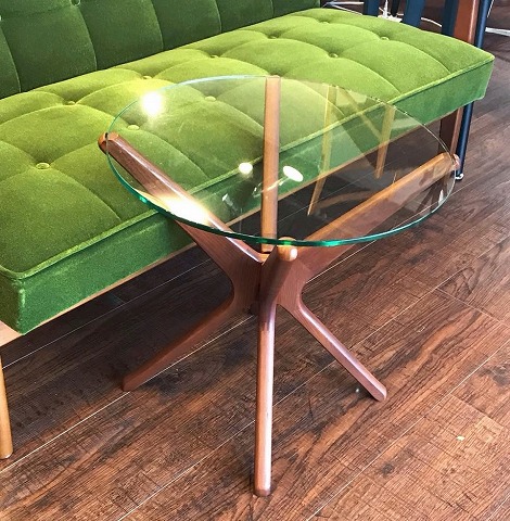 ヴィンテージライクな4本脚の木製ベースに、円形ガラスの天板を組み合わせたデザイン。