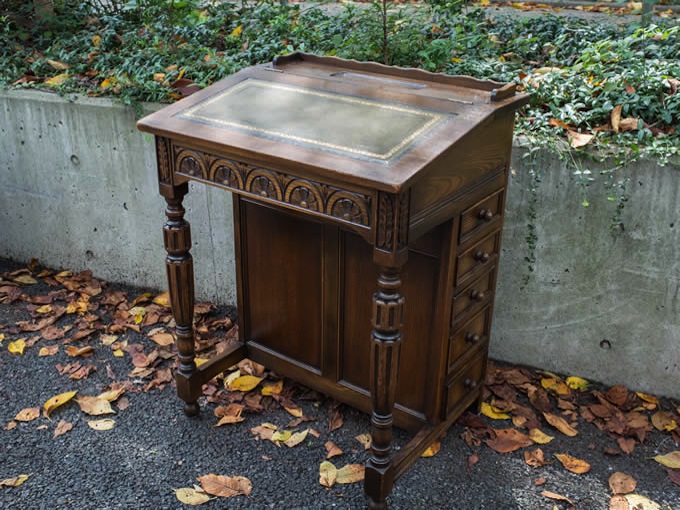 イギリスアンティークのダベンポートデスク。ダベンポートデスクとは蝶番式の傾斜蓋と側面に引き出しのある小型の書き物机です。彫りもすばらしく。これぞイギリスアンティークといった趣があります。