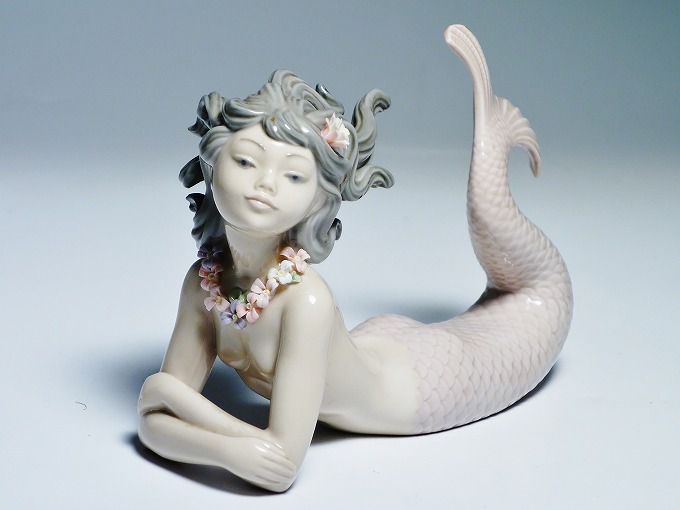 リヤドロののフィギュリイン『ファンタジー』(No.1414)。花の首飾りをした人魚がモデル。風に髪をなびかせながら、涼しげな眼差しでこちらを見つめています。